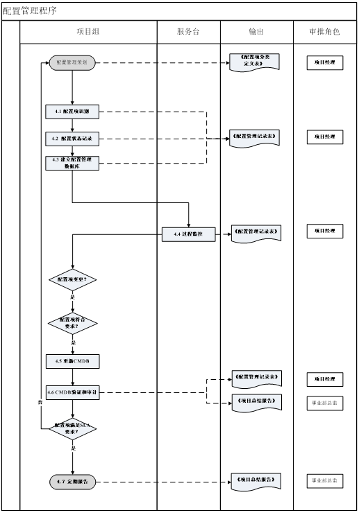 4.8.1 根据配置管理策划的要求,项目经理应定期对配置管理数据库的状况进行报告,完成《项目总结》,由部门经理审批。